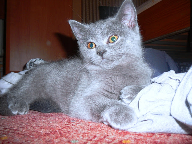 P.S A až bude citově vyvinutý, což si myslím bude brzy, páč už se potřebuju vyspat, tak ho naučíme lovit myši. Textilní chytá bravurně, číhá na ně, přehazuje si je z packy na packu a pak je odnáší v zubech do úkrytu, ale brzy to zkusí naostro. Moje teta Dana má totiž ve svém panelákovém bytě už dva týdny myš. Zkusila na ni kde co, ale nepomáhá domluva ani brutální pasti. Vyzkouší tedy britskou modrou. O průběhu akce vás budu informovat. :o)) |